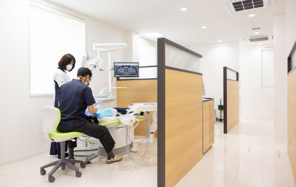周囲の気配や視線が気にならないようプライバシーに配慮して各チェアごとに仕切りを設けたセパレートタイプの診療室です。圧迫感がなく、ゆったりと治療に専念していただけます。